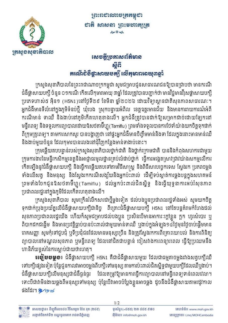 វិទ្យាស្ថានជាតិសុខភាពសាធារណៈបានរកឃើញកុមារាអាយុ៣ឆ្នាំម្នាក់នៅខេត្តឧត្តរមានជ័យ មានវីរុសផ្តាសាយបក្សីប្រភេទហាស់ ៥អ៊ិន១ (H5N1) កាលពីថ្ងៃអាទិត្យ បន្ទាប់ពីកុមារារូបនេះបានលេងជុំវិញបរិវេណដែលមានមាន់ទាងាប់។