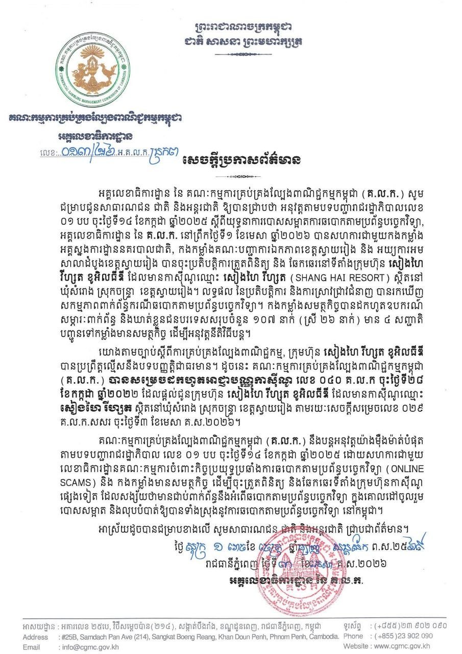 តាមសេចក្តីប្រកាសព័ត៌មានចុះថ្ងៃទី៣ ខែមេសា ឆ្នាំ២០២៦ របស់ គ.ល.ក. បានឱ្យដឹងថា កងកម្លាំងសមត្ថកិច្ចបានដកហូតឧបករណ៍សម្ភារៈពាក់ព័ន្ធ និងឃាត់ខ្លួនជនបរទេសសរុបចំនួន ១០៧នាក់ (ស្រី២៦នាក់) មាន ៤សញ្ជាតិ អំឡុងពេលចុះត្រួតពិនិត្យ និងឆែកឆេរទីតាំងក្រុមហ៊ុន សៀងហៃ រីហ្សត ខូអិលធីឌី ដែលមានកាស៊ីណូឈ្មោះ សៀងហៃ រីហ្សត ស្ថិតនៅឃុំសំរោង ស្រុកចន្ទ្រា ខេត្តស្វាយរៀង។