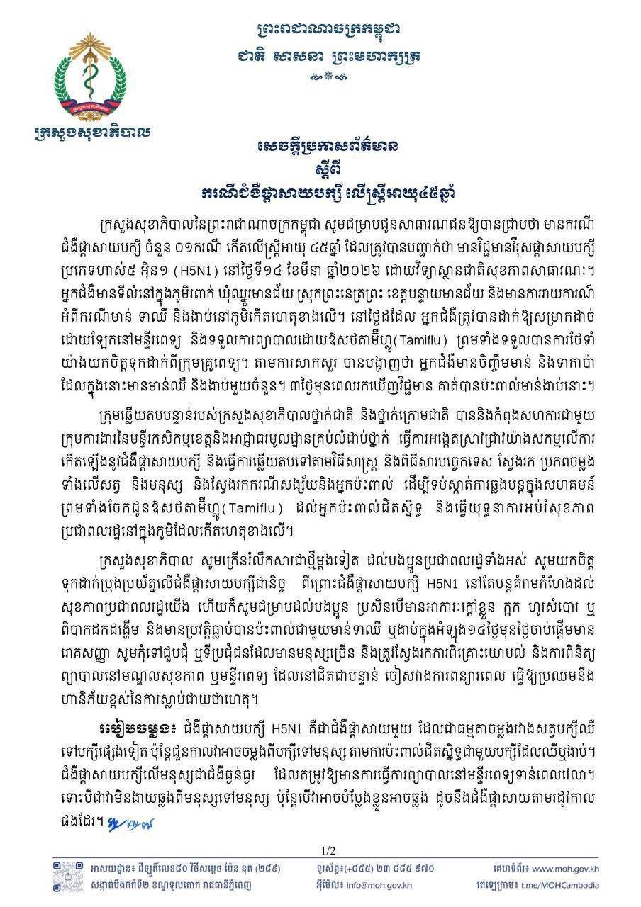 ក្រសួងសុខាភិបាល បានប្រកាសរកឃើញករណីឆ្លងវីរុសផ្តាសាយបក្សីប្រភេទ H5N1 មួយករណី កើតលើស្ត្រីអាយុ៤៥ឆ្នាំម្នាក់ រស់នៅខេត្តបន្ទាយមានជ័យ បន្ទាប់ពីស្ត្រីរូបនេះបានប៉ះពាល់ផ្ទាល់ជាមួយសត្វចិញ្ចឹម ដែលឈឺងាប់។
