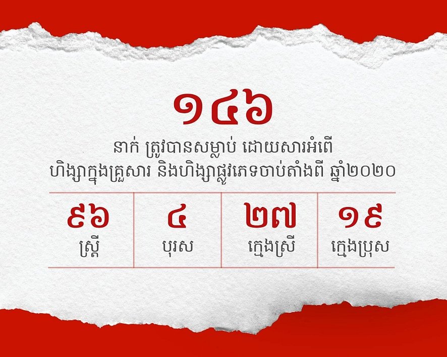 តាមរយៈអត្ថបទមួយចេញផ្សាយនៅថ្ងៃទី១៦ ខែតុលា ឆ្នាំ២០២៥ អង្គការសម្ព័ន្ធខ្មែរជំរឿន និងការពារសិទ្ធិមនុស្ស ហៅកាត់ថា លីកាដូ(LICADHO) បានឱ្យដឹងថា អំពើហិង្សាក្នុងគ្រួសារ និងអំពើហិង្សាផ្លូវភេទបានកើតឡើងជាច្រើនករណី បណ្តាលឱ្យជនរងគ្រោះយ៉ាងហោចណាស់ចំនួន ១៤៦នាក់បានស្លាប់បាត់បង់ជីវិត ក្នុងនោះមានកុមារចំនួន ៤៦នាក់ ក្នុងរយៈពេលជាង៥ឆ្នាំចុងក្រោយនេះ។