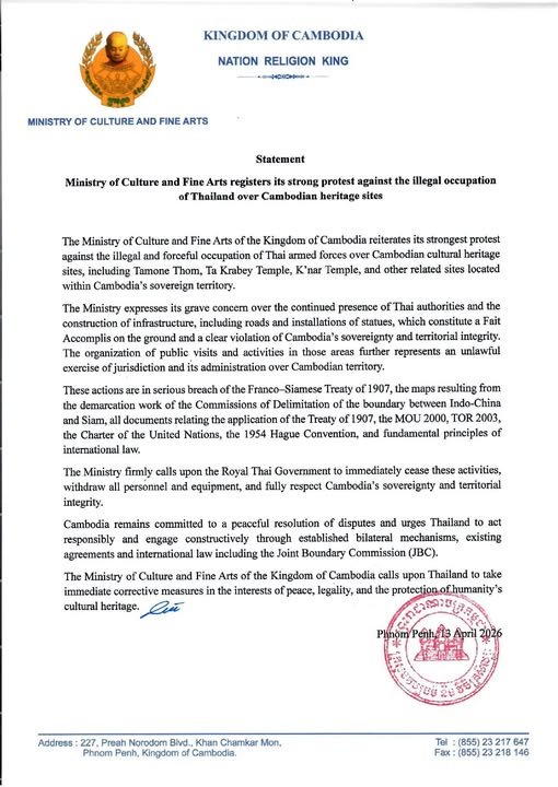 នៅក្នុងសេចក្តីថ្លែងការណ៍កាលពីថ្ងៃទី១៣ ខែមេសា ឆ្នាំ២០២៦ ក្រសួងវប្បធម៌ និងវិចិត្រសិល្បៈ បានបញ្ជាក់ថា ប្រទេសថៃបានកាន់កាប់ដោយខុសច្បាប់នៅតំបន់បេតិកភណ្ឌវប្បធម៌របស់កម្ពុជារួមមានប្រាសាទតាមាន់ធំ ប្រាសាទតាក្របី ប្រាសាទខ្នារ និងតំបន់ពាក់ព័ន្ធផ្សេងៗទៀត ដែលស្ថិតក្នុងដែនអធិបតេយ្យភាពកម្ពុជា។