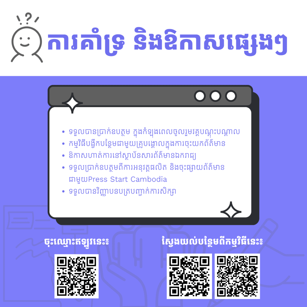 – សិក្ខាកាមដែលបញ្ចប់វគ្គអាចនឹងទទួលបានឱកាសដូចជា៖ ការបង្វឹកបន្ថែមដោយចុះយកព័ត៌មានជាមួយគ្រូបង្គោល ឱកាសហាត់ការនៅស្ថាប័នសារព័ត៌មានឯករាជ្យ និងទទួលបានការឧបត្ថមពីការអនុវត្តផលិត និងចុះផ្សាយព័ត៌មានជាមួយPress Start Cambodia។